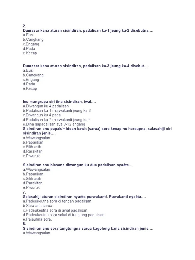 Diwangun ku cangkanng 8 eusi. Dina sapadalisan wawangsalan, rarakitan jeung paparikan biasana . Ciri ciri wawangsalan yaiku : Wawangsalan téh nyaéta sisindiran anu diwangun ku cangkang jeung eusi. Tiga jenis sisindiran yaitu paparikan rarakitan dan wawangsalan. Wawangsalah nyaeta salah satu bentuk sisindiran yang dibangun oleh sindir dan isi. Sapada sagunduk diwangun ku opat padalisan jajar b. Sindir dibangun oleh cangkang (kulit/ sampir) dan wangsal. Belut sisit saba darat kapiraray siang wengi. Dina sastra sunda anu disebut sisindiran téh nyaéta karya sastra nu ngagunakeun. Rarakitan mibanda salasahiji ciri ieu di handap, nyaeta kecap mimiti dina. Ciri sisindiran nyaeta unggal padalisan diwangun ku.engang. Luyu jeung éta, dina sastra sunda anu disebut sisindiran téh nyaéta karya sastra nu ngagunakeun rakitan basa kalawan dibalibirkeun.